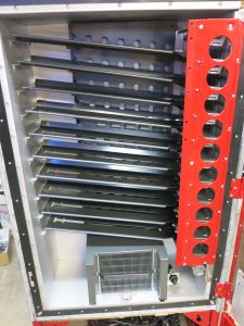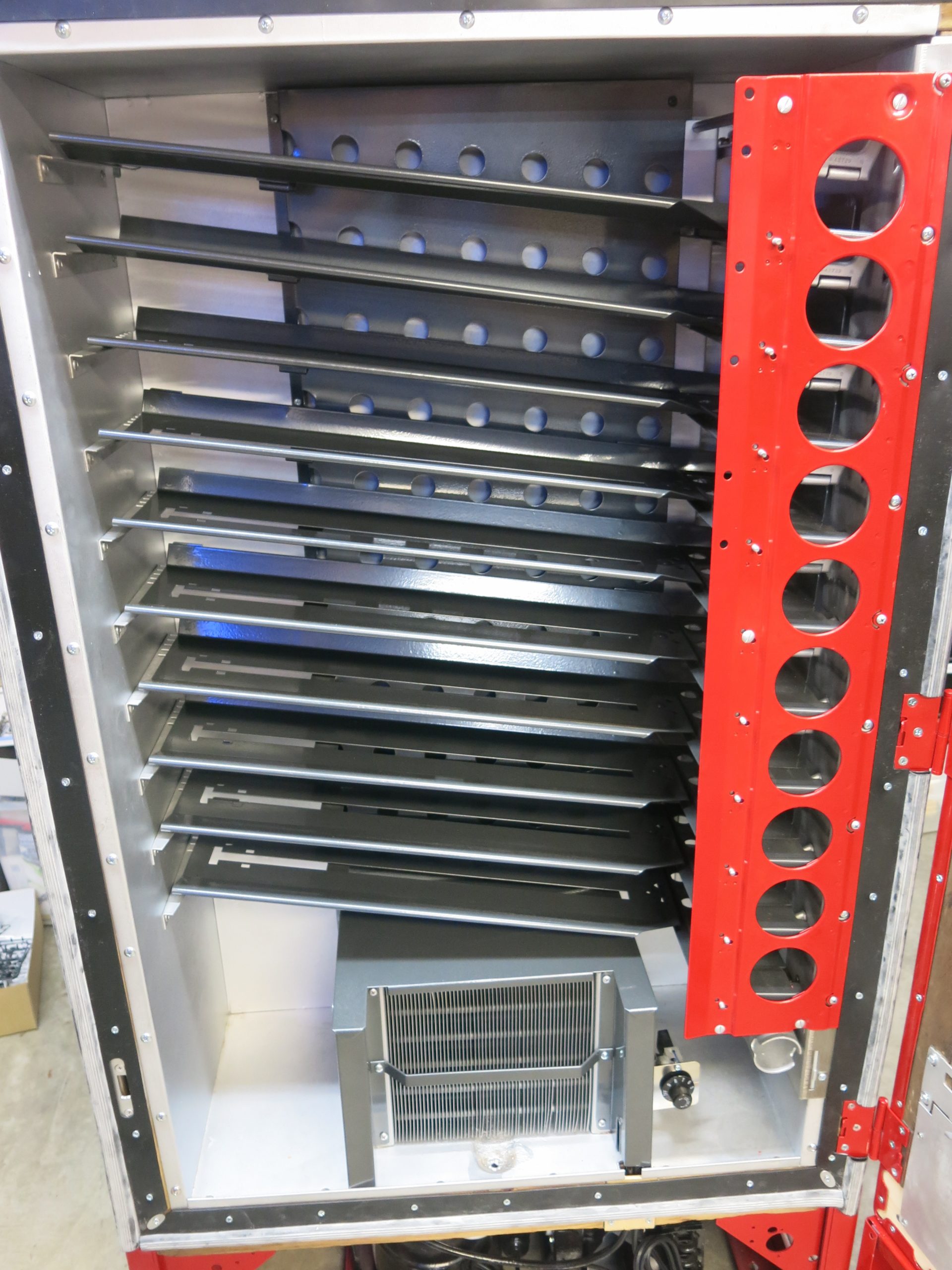 Inside the Vendo 6 case vertical shows slightly different with powder coated shelves and cooling system cover