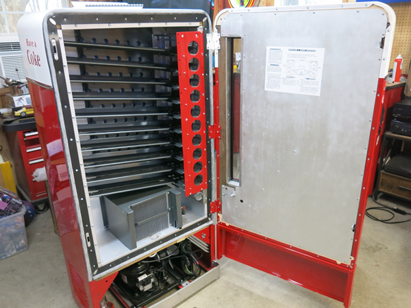 Inside the V-81 Coca Cola Machine Restoration after features all new gaskets, plastic door liner, insulation, decals, bottle door light, wiring and we powder coated the vending mechanism and shelves