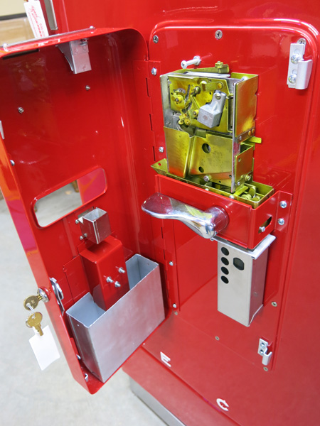 Inside the coin door of this Vendo 110 Coke Machine after our Full Restoration. We yellow zinc coat the coin mechanism, re-chromed the castings and restored the other components