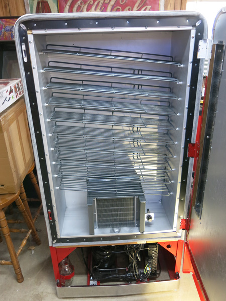 We restored all internal parts, installed new insulation, re-assembled the parts, installed new gaskets, breaker strips, leg levelers, drain assembly, and powder coated the vending rack and shelves. We rebuilt the original cooling system, installed new fan motors, thermostat, all new wiring, power cord and a new compressor with a 2 year warranty